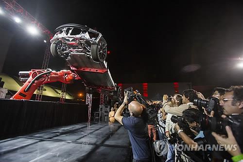 | △ (AP=연합뉴스) 미국의 대표적 전기자동차 업체인 테슬라모터스가 9일(현지시간) 미 캘리포니아주 호손에서 신차 '테슬라 D' 발표회를 열고 있다. marshal@yna.co.kr |