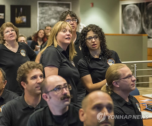 | △ 오, 명왕성! (로렐<美메릴랜드주> AP=연합뉴스) 미국 우주탐사선 뉴호라이즌스가 14일(현지시간) 태양계 끄트머리에 위치한 명왕성에 가장 가까운 약 1만2천550㎞ 거리까지 접근해 들어가자 미 메릴랜드주 로렐의 존스홉킨스대 응용물리학 연구실에서 이를 화면으로 지켜보던 연구진이 흥분과 긴장을 감추지 못하고 있다. marshal@yna.co.kr |