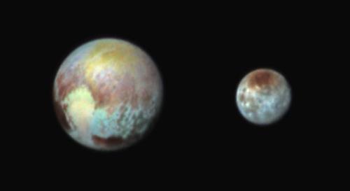 미국 항공우주국(NASA)은 뉴호라이즌스에 실린 '랠프' 관측 장비의 컬러 필터 3개를 써서 얻은 명왕성과 그 위성 카론의 사진을 15일(이하 한국시간) 공개했다.