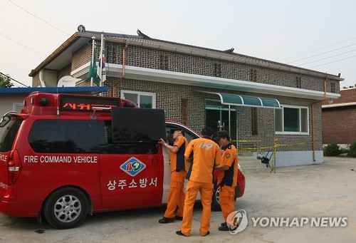 | △ 마을회관 소방 출동 (상주=연합뉴스) 김선형 기자 = 14일 오후 경북 상주시 금계1리 마을회관에 소방대원들이 나와있다. 마을회관에선 전날 남은 음료수를 나눠 마신 할머니 6명이 쓰러지는 사고가 발생했다. 2015.7.14 sunhyung@yna.co.kr |