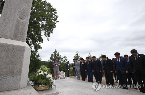 | △ 이상설 유허비 찾은 유라시아 친선특급 대표단 (우수리스크<러시아>=연합뉴스) 김도훈 기자 = 15일(현지시간) 오전 유라시아 친선특급 대표단들이 러시아 우수리스크 수이푼 강 인근 이상설 유허비를 찾아 묵념을 하고 있다. 이상설 선생은 1907년 고종의 밀지를 받아 이준, 이위종 선생과 함께 헤이그 만국평화회의에 특사로 참석하려다 일본에 의해 거부당했다. 1917년 48세의 나이로 작고한 이 선생은 임종을 앞두고 "광복을 못 보고 이 세상을 떠나니 어찌 조국으로 돌아갈 수 있으랴"며 자신의 몸과 유품을 불태우고 그 재를 바다에 버리고 제사도 지내지 말 것을 당부했다. 그의 유언에 따라 유골은 수이푼강에 뿌려졌고 2001년 10월 광복회와 고려학술문화재단이 그의 유골이 뿌려졌을 것으로 추정되는 지점에 유허비를 세웠다. |