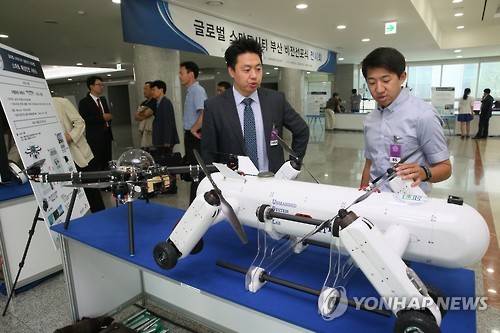 | △ (서울=연합뉴스) 진성철 기자 = 15일 국회 의원회관에서 열린 '글로벌 스마트시티 부산 비전선포식 전시회'에서 한 참가 업체가 LTE기반 실시간 HD영상 모니터링 제공이 가능한 드론을 이용하는 '스마트 해상안전 서비스'를 선보이고 있다. 2015.7.15 zjin@yna.co.kr |