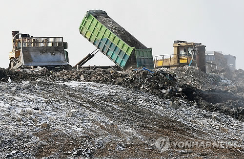 | △ 매립되는 수도권 쓰레기 (인천=연합뉴스) 윤태현 기자 = 인천시가 2016년 수도권매립지 사용을 종료한다는 기존 원칙을 고수한 가운데 3일 오전 인천시 서구 수도권매립지에서 한 근로자가 수도권에서 수집한 쓰레기를 매립지역에 내리고 있다. 2014.12.3 tomatoyoon@yna.co.kr |