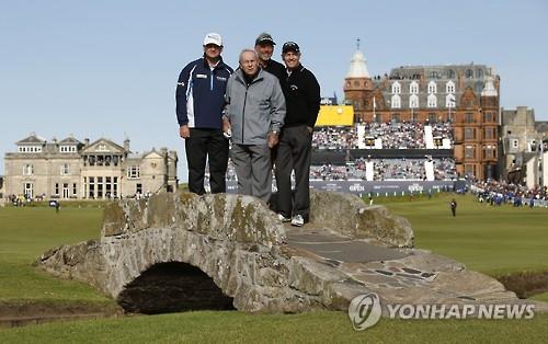 | △ 세인트앤드루스 올드코스의 스윌컨 다리에서 포즈를 취한 아널드 파머 팀 (AP=연합뉴스) |