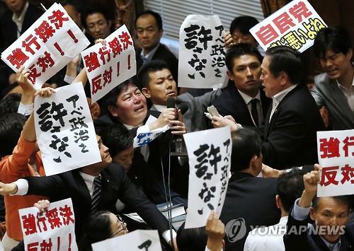 표결에 앞서 진행된 찬반 토론에서 반대 토론자로 나선 오카다 가쓰야(岡田克也) 민주당 대표는 "국민 8할이 정부의 설명이 부족하다고 하고, 과반이 위헌이라고 보거나 법안에 반대한다고 답하는 와중에 강행 처리하는 것은 전후 일본 민주주의의 큰 오점"이라며 "지금 아베 총리가 해야 할 일은 즉각 법안을 철회하는 것 뿐"이라고 비판했다. (취재보조: 이와이 리나 통신원)