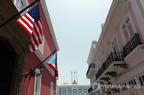 | △ 푸에르토리코 올드산후안의 자치령 주지사 관저에 미 성조기와 푸에르토리코 자치령 기가 내걸려 있는 모습. (AP=연합뉴스 자료사진) |