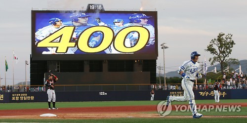 | △ 400홈런 대기록 달성한 이승엽 (포항=연합뉴스) 김주성 기자 = 3일 오후 경북 포항야구장에서 열린 프로야구 삼성 대 롯데 경기. 3회말 2사에 두번째 타석에 들어선 이승엽이 한국프로야구 개인 통산 400홈런을 친 뒤 홈으로 달려가고 있다. 2015.6.3 utzza@yna.co.kr |