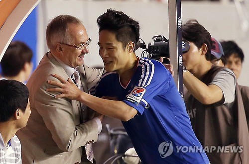 | △ 골 넣고 상대팀 감독에게 (안산=연합뉴스) 신준희 기자 = 17일 경기도 안산 와스타디움에서 열린 프로축구 K리그 올스타전 팀 슈틸리케와 팀 최강희의 경기. 팀 최강희 김호남이 골을 성공시킨 뒤 상대팀 감독인 슈틸리케 감독에게 안기고 있다. 2015.7.17 hama@yna.co.kr |