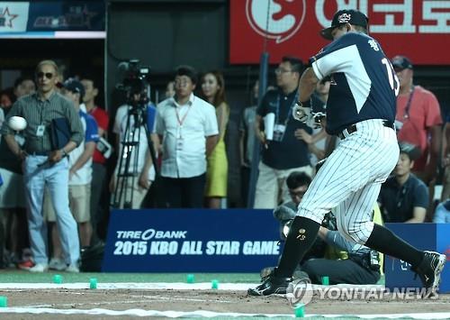 | △ (수원=연합뉴스) 박정헌 기자 = 롯데 화재균이 17일 수원 KT위즈파크에서 벌어진 '2015 올스타 프라이데이 인터파크 홈런레이스'에 참가해 공을 치고 있다. 2015.7.17 home1223@yna.co.kr |