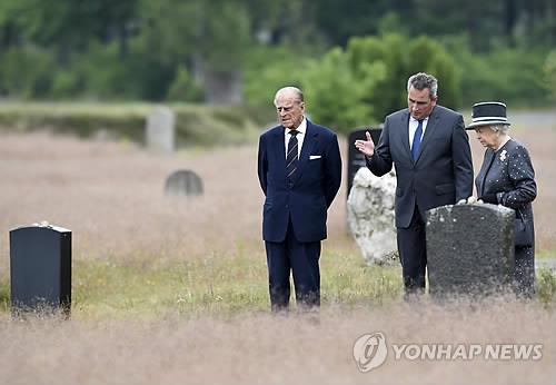 | △ (베르겐-벨젠<독일> AP=연합뉴스) 독일을 국빈 방문 중인 영국 왕실의 엘리자베스 2세 여왕(오른쪽)과 부군 필립공(왼쪽)이 6월 26일(현지시간) 니더작센주 베르겐-벨젠 나치 강제수용소를 둘러보며 수용소 책임자의 설명을 듣고 있다. 베르겐-벨젠 수용소는 나치가 전쟁포로와 유대인들을 수용했던 곳으로 '안네 프랑크의 일기'로 유명한 유대인 소녀 프랑크가 숨지기 직전까지 지냈던 장소로 알려져 있다. |