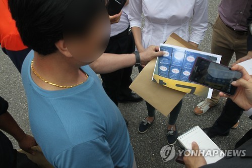 | △ 항의하는 '농약 사이다' 피의자 가족 (상주=연합뉴스) 김선형 기자 = '농약 사이다' 살해사건 피의자 박모(82) 할머니의 사위가 20일 오후 대구지방법원 상주지원에서 경찰 수사에 항의하며 기자들에게 박카스병 제조번호를 설명하고 있다. 2015.7.20 sunhyung@yna.co.kr |