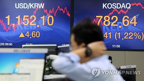 | △ 코스닥, '나 홀로 랠리'…780선 돌파 (서울=연합뉴스) 최재구 기자 = 20일 서울 명동 외환은행 본점에서 직원이 환율, 코스닥 등을 모니터하고 있다. 코스닥지수는 9.41포인트(1.22%) 오른 782.64로 2007년 11월 7일 794.08(종가 기준) 이후 7년 8개월 만의 최고치이다. |
