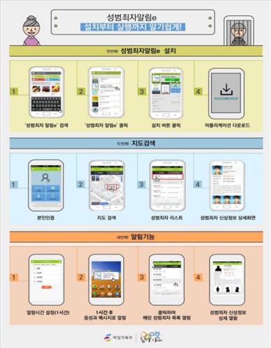 여가부는 "휴대전화에 '성범죄자 알림e' 앱을 내려받으면 인근에 거주하는 성범죄자 신상정보를 실시간으로 확인할 수 있어 도움이 될 것"이라고 덧붙였다.