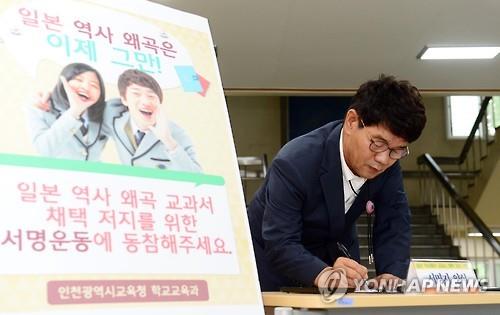 (인천=연합뉴스) 신민재 기자 = 다음 달 일본 지방정부들의 중학교 교과서 채택을 앞두고 극우 성향의 역사 왜곡 교과서를 사용하지 말도록 촉구하는 서명운동에 10만명이 넘는 인천지역 학생과 교직원이 동참했다.