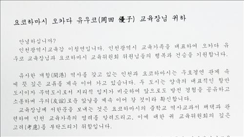 이 교육감은 22일 인천의 우호도시인 일본 요코하마시의 교육위원회를 이끄는 오카다 유우코(岡田優子) 교육장에게 서한을 발송했다.