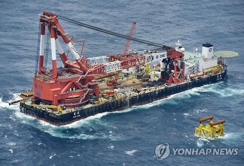 | △ 2013년 7월 5일 동중국해 해상에서 촬영한 중국의 가스전 관련 시설(오른쪽 아래 노란색 구조물)과 해상 크레인선의 모습(교도.연합뉴스.자료사진) |