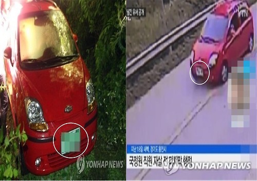 먼저, 국정원 직원 임모(45)씨의 차량이 지난 18일 오전 6시 20분께 마지막으로 찍힌 CC(폐쇄회로)TV 영상에서 차량 번호판 색깔이 녹색이 아닌 흰색으로 보인다는 점이다. 임씨의 차에는 녹색 바탕의 흰색 글씨가 적힌 '구형' 번호판이 달려있다.