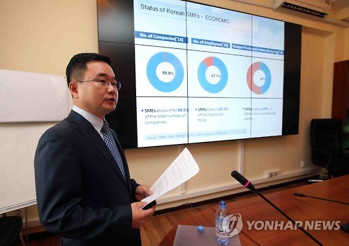 | △ 중진공, 카자흐에 청년창업프로그램 전수 (알마티=연합뉴스) 김현태 특파원 = 이병하 주알마티 중소기업진흥공단(중진공) 수출인큐베이터 소장이 22일 카자흐스탄 경제중심지 알마티에서 열린 중진공의 '청년창업사관학교' 프로그램 설명회에서 카자흐스탄 중소기업개발공사 직원들에게 설명을 하고 있다. 이병하 소장은 "한국 중소기업 지원 프로그램의 국외 전수사업의 하나로 이번 설명회가 열렸다"며 "청년창업을 지원할 때 필요한 각종 기법을 현지에 전수할 계획이다"라고 밝혔다. |