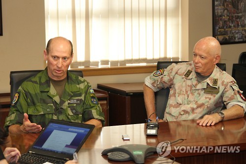 | △ 인터뷰하는 판문점 중립국감시위원회 스위스·스웨덴 대표 (서울=연합뉴스) 판문점 중립국감독위원회(중감위·NNSC)의 스위스 대표인 우르스 게르브르 육군 소장(오른쪽)과 중감위 스웨덴 대표인 마츠 잉그맨 공군 소장이 지난 21일 서울 용산 유엔사령부에서 연합뉴스와 인터뷰를 하고 있다. |