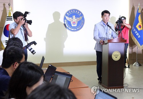 | △ '국정원 직원 차 진위 논란' 브리핑 (수원=연합뉴스) 류수현 기자 = 23일 오후 경기도 수원시 경기지방경찰청에서 윤세진 과학수사계장이 '국정원 직원 차 바꿔치기 논란'에 대한 입장을 발표하고 있다. |