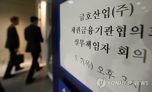 | △ 지난 5월 서울 여의도 KDB산업은행 본관에서 열린 금호산업 채권금융기관 협의회 실무책임자 회의에서 참석자들이 대기실로 이동하고 있는 모습. (연합뉴스 자료사진) |