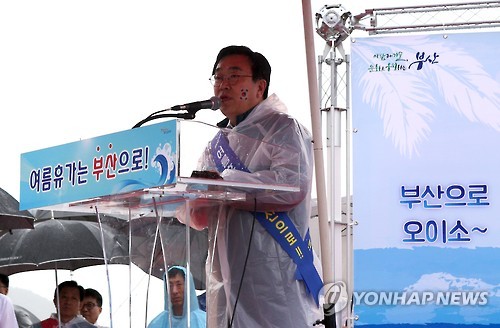 | △ 부산 메르스 종식 선포 (부산=연합뉴스) 조정호 기자 = 20일 부산 해운대해수욕장에서 서병수 시장이 메르스 종식을 선포하고 있다. 부산에서는 지난달 6일 첫 메르스 환자가 발생한 이후 방역당국의 관리를 받은 사람이 1천400여명에 달했지만 모두 격리 해제됐다. |