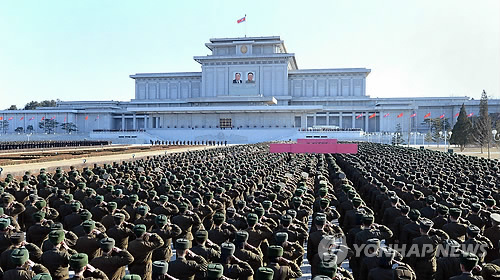 | △ 북한, 반미 장병결의대회…지도부 대거 참석 북한군이 오는 27일 정전협정 체결 62주년 기념일을 앞두고 24일 대규모 결의대회를 열어 반미의식을 고취했다. 사진은 올해 초 김정일 국방위원장의 생일인 '광명성절'(2월 16일)을 앞두고 열린 결의대회. |
