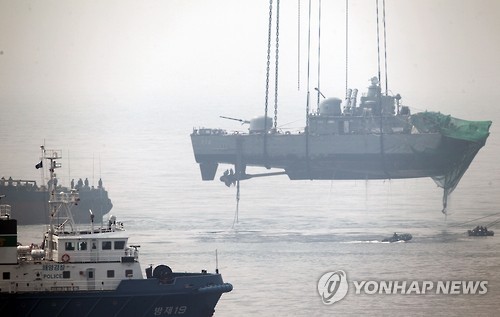 | △ 북한 "남한 도발 배후는 미국"…백령도 조준사격 '경고' 북한은 서해 해역에서 남측이 최근 벌이는 군사 도발의 배후에 미국이 있다고 주장하면서 도발이 계속될 경우 백령도 등 일대에 대한 조준사격 가능성을 시사했다. 사진은 2010년 백령도 해상에서 피격된 천안함 함미를 바지선에 적재하는 모습. |