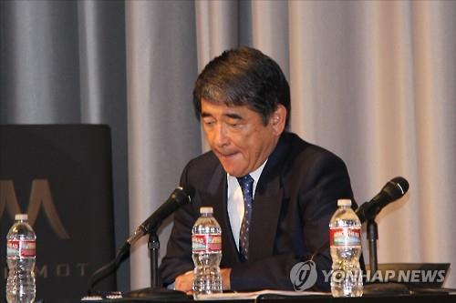 | △ 미국 유대인 인권단체 시몬 비젠탈 센터에서 징용 피해자인 제임스 머피(94) 씨를 만나 머리를 숙인 일본 미쓰비시 머티리얼 사외이사.(연합뉴스 자료사진) |