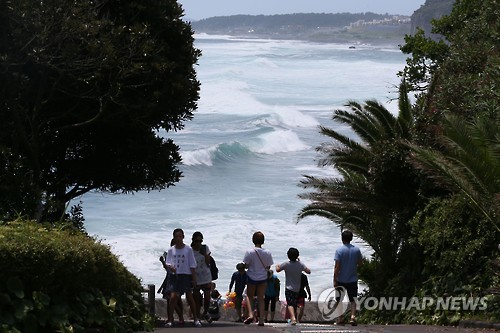 | △ (서귀포=연합뉴스) 박지호 기자 = 북상 중인 제12호 태풍 '할롤라(HALOLA)'의 영향으로 26일 제주 서귀포 중문해수욕장에 입욕통제령이 내려진 가운데 이날 오후 해변을 찾은 관광객들이 평소보다 높아진 파도를 구경하고 있다. 2015.7.26 jihopark@yna.co.kr |