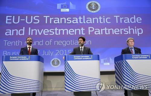 | △ 지난 17일 브뤼셀에서 EU-미국 TTIP 10차 협상이 끝난 후 협상 대표들이 기자회견을 하고 있다.(AFP=연합뉴스) |
