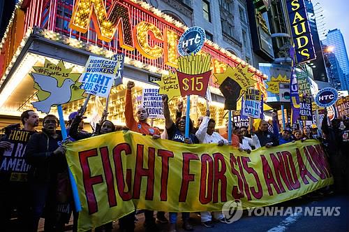 (서울=연합뉴스) 이 율 기자 = 2012년 미국 뉴욕 맨해튼의 패스트푸드 식당 종업원들의 시위에서 시작돼 미국 전역으로 퍼지고 있는 최저임금 인상 바람이 미국 대통령선거에서 '뜨거운 감자'로 부상하고 있다.