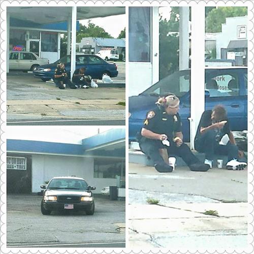 (서울=연합뉴스) 한미희 기자 = 주유소 마당에 주저앉아 노숙자와 함께 밥을 나눠 먹는 미국 경찰의 사진이 온라인에서 화제다.