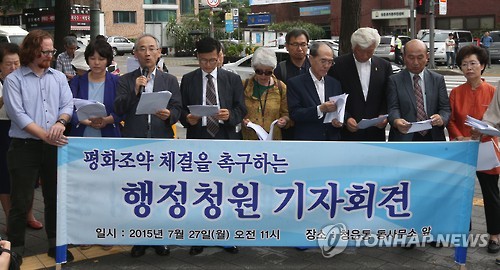 | △ 기독교단체 '평화조약 체결위한 행정청원' 기자회견 (서울=연합뉴스) 임헌정 기자 = 한국기독교교회협의회 화해·통일위원회 관계자들이 27일 서울 종로구 청운동주민센터 앞에서 '평화조약 체결을 위한 행정청원 기자회견'을 하고 있다. 2015.7.27 kane@yna.co.kr |
