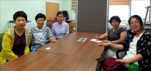 | △ 충남 공주대 한민족교육원에서 동포재단 초청으로 '조선어교원 역량 강화 연수'에 참여한 교사들. 왼쪽부터 김홍매, 채주옥, 이경매, 이일숙, 김춘금 |