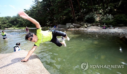 | △ 다이빙은 이렇게 (울산=연합뉴스) 이상현 기자 = 27일 울산에 폭염경보가 발효된 가운데 울산 12경의 한 곳인 울주군 작괘천에서 청소년들이 계곡에 다이빙하고 있다. 2015.7.27 leeyoo@yna.co.kr |
