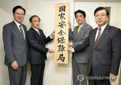 | △ 2014년 1월 7일 국가안전보장국 현판식 때 아베 신조(오른쪽 두 번째) 총리와 함께 현판을 잡은 이소자키 요스케(磯崎陽輔. 오른쪽 첫번째) 보좌관의 모습.(교도=연합뉴스 자료사진) |