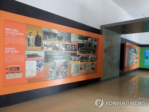 | △ 조선의용군열사기념관 내부 (한단<중국>=연합뉴스) 고현실 기자 = 중국 허베이(河北)성 한단(邯鄲)시 섭(涉)현에 위치한 조선의용군열사기념관 내부. 지난 2004년 중국 지방정부의 지원을 받아 건립된 기념관은 조선의용대와 관련한 자료를 한국어와 중국어로 전시하고 있다. 2015.7.23 okko@yna.co.kr |