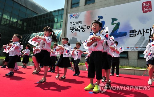 | △ 광복둥이 독도탐사대 출정식 (포항=연합뉴스) 28일 오전 포항 여객선터미널에서 열린 '광복둥이 독도탐사대' 출정식에 참여한 어린이들이 공연을 하고 있다. 지난 5월 선정된 경북도내 광복둥이 100명은 독도를 찾아 독도가 우리 땅임을 다시 한 번 천명한다. 2015.7.28 <<경북도>> psykims@yna.co.kr |