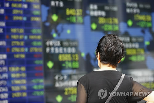 | △ 亞증시, 中주가 폭락속 '여파' (도쿄 AP=연합뉴스) 아시아 주요국의 주식시장이 28일 중국 주가 폭락의 후폭풍에 하락 흐름을 보였다. 한국 코스피는 오전 10시1분 현재 전날보다 19.06포인트(0.93%) 내린 2,019.75를 나타냈다. 일본 도쿄증시에서 닛케이평균주가는 10시 53분 현재 전장보다 1.18% 내려간 20,110.50에 거래됐다. 사진은 도쿄의 한 증권사에서 한 여성이 주식 시세 전광판을 바라보는 모습. |