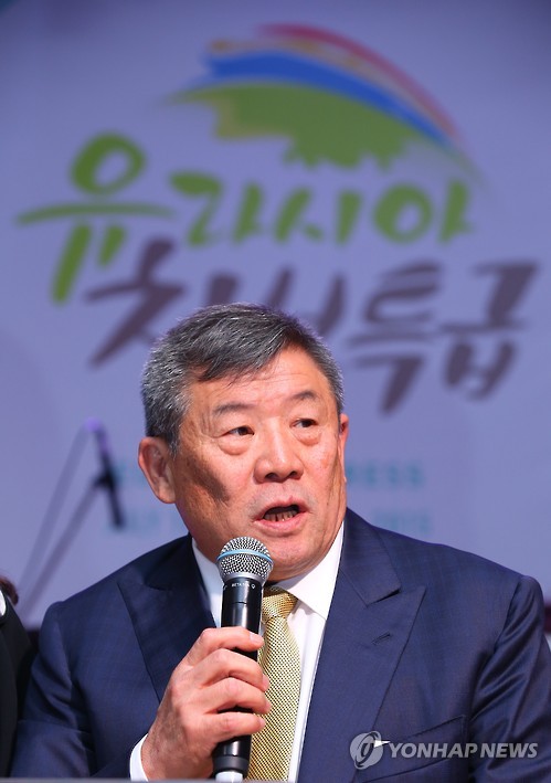 | △ 환영사하는 조 바실리 회장 (모스크바=연합뉴스) 김도훈 기자 = 28일(현지시간) 러시아 모스크바 롯데호텔에서 열린 '재러동포와의 만남' 행사에서 조바실리 전러시아고려인연합회장이 동포 환영사를 하고 있다. 이번 행사는 전러시아고려인연합회와 모스크바한인회가 유라시아 친선특급 대표단을 환영하기 위해 마련했다. superdoo82@yna.co.kr |