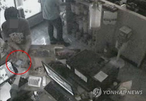 | △ "전화 한 통 쓸게요" 스마트폰 넘겨받아 도주 (화성=연합뉴스) PC방 종업원에게 "전화 한 통 쓰자"며 스마트폰을 넘겨받아 도주하는 수법으로 스마트폰 34대(2천485만원 상당)를 훔친 3인조가 경찰에 구속됐다. 지난 18일 오후 10시 50분께 경기도 화성시 송산면 한 PC방에서 피의자가 종업원에게 스마트폰을 넘겨받고 있다.2015.7.29<<화성서부경찰서>> goals@yna.co.kr |