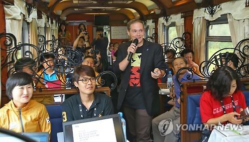 | △ (페름<러시아>=연합뉴스) 김도훈 기자 = 25일(현지시간) 오후 러시아 예카테린부르크를 출발해 모스크바를 향해 달리는 유라시아 친선특급 열차 안에서 평양주재 독일 대사관 얀 야노프스키 2등 서기관이 특별 강연을 하고 있다. |