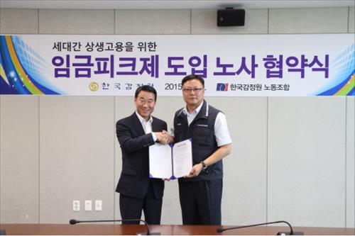 | △ 한국감정원 서종대 원장(왼쪽)과 노동조합 백승규 위원장은 30일 임금피크제 도입에 합의했다. |