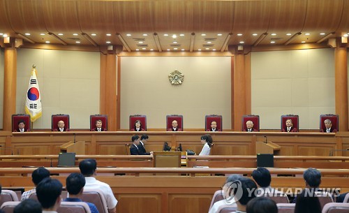 | △ 헌재, 선거법 '인터넷 실명제' 위헌 여부 오늘 결정 (서울=연합뉴스) 이정훈 기자 = 박한철 헌법재판소장(가운데)과 재판관들이 30일 오후 서울 종로구 헌법재판소 대심판정에 입장, 착석해 있다. 헌법재판소는 이날 선거운동 기간 언론사 홈페이지에 후보자나 정당 관련 글을 올리려면 실명 인증을 받도록 한 공직선거법상 인터넷 실명제 위헌 여부를 결정한다. 2015.7.30 uwg806@yna.co.kr |