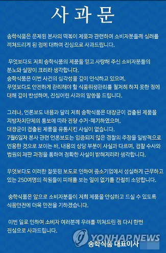 한편 경찰은 이달 초 언론보도를 통해 이번 사건이 알려진 직후 송학식품이 자사 인터넷 홈페이지에 올린 사과문은 거짓이라고 밝혔다.