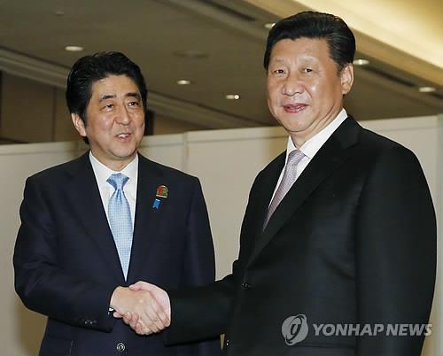 | △ 시진핑 중국 국가주석(오른쪽)과 아베 신조 일본 총리. 두 정상은 지난 4월 인도네시아 자카르타에서 열린 아시아 아프리카 정상회의 기간 중 양자회담을 했다.(AP=연합뉴스DB) |
