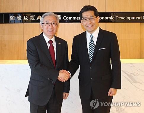 | △ (홍콩=연합뉴스) 최현석 특파원 = 김종덕 문화체육관광부 장관(왼쪽)이 16일 홍콩정부청사에서 그레고리 소(蘇錦樑) 홍콩 상무·경제발전국 국장을 만나 전염병에 대한 불안감 완화와 상호 관광 활성화 방안을 논의한 후 악수하고 있다. 2015.7.17 |
