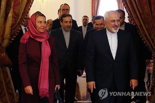 | △ (테헤란 AP=연합뉴스) 페데리카 모게리니 EU 외교안보 고위대표(왼쪽)와 모하마드 자바드 자리프 이란 외무장관이 지난달 28일 회담장으로 들어가고 있다. |