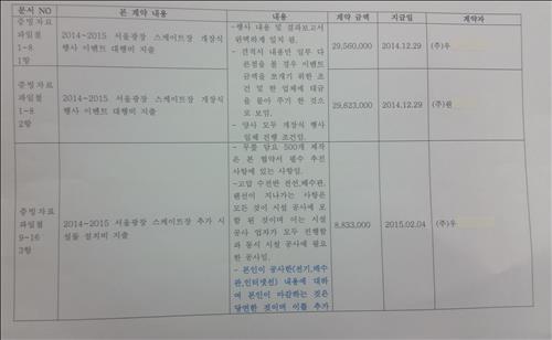 그러나 전문가들은 "설치비 명목으로 제시된 전선·배수관 등 공사와 링크장 바닥 로고 인쇄·해빙 작업, 간판·벤치 설치 작업 등은 모두 처음 계약에 포함된 내용"이라며 "자사가 공사한 내용을 자사가 마감한 것은 당연한 내용인데 예산을 이중지급한 것"이라고 지적했다.